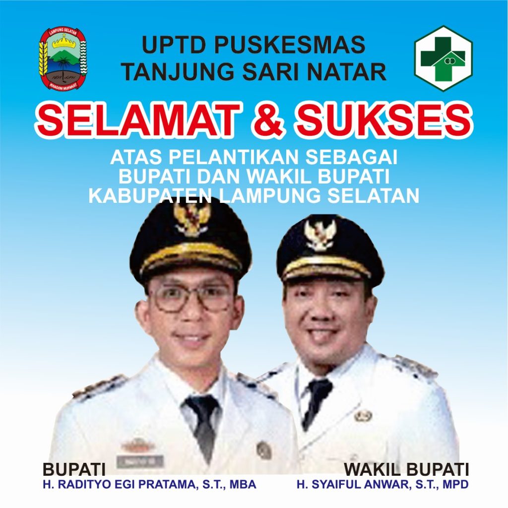 pkmtanjungsarinatar.lampungselatankab.go.id. Kepala UPTD Puskesmas Tanjung Sari Natar dan Seluruh Staf mengucapkan Selamat dan Sukses atas dilantiknya H. Radityo Egi Pratama, S.T., MBA dan H. Syaiful Anwar, S.T., MPD sebagai Bupati dan Wakil Bupati Kabupaten Lampung Selatan Periode 2025-2030.